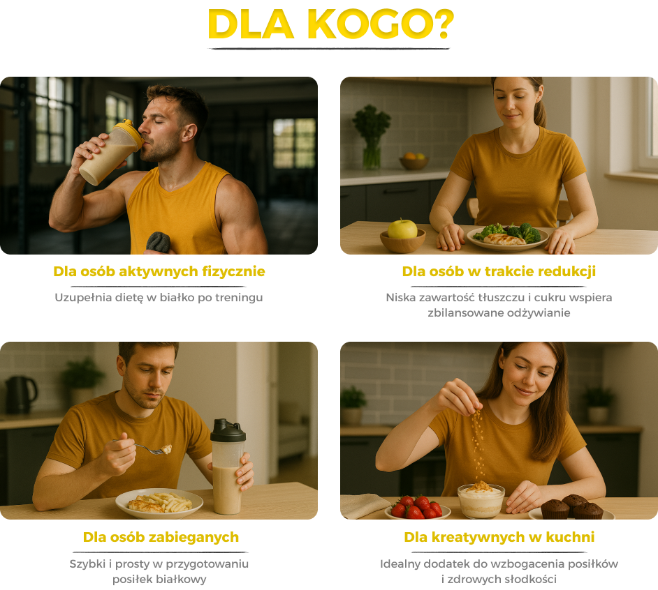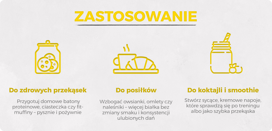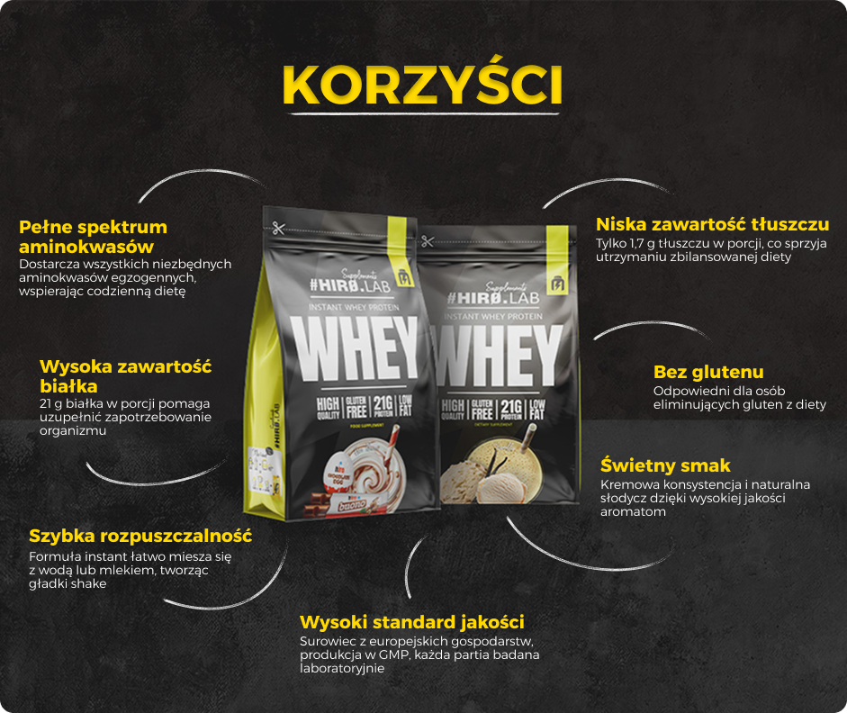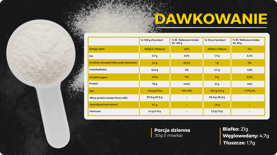 - 21 g białka w porcji (30 g) – wysoka koncentracja pełnowartościowego białka serwatkowego.